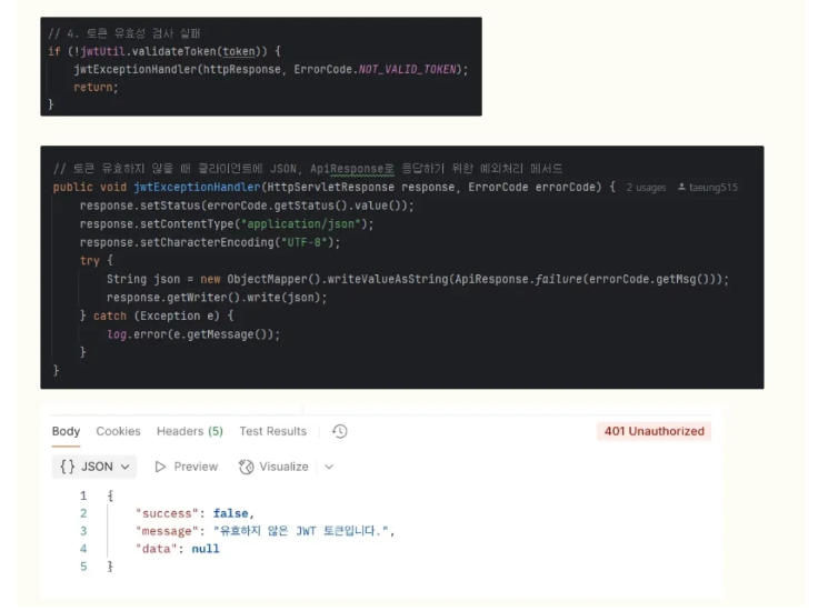 필터에서 발생한 예외는 직접 HttpServletResponse를 조작해야 하므로, 다음과 같이 JSON 형태의 에러 응답을 내려주는 예외처리 메서드를 필터 내부에 별도로 구현하였습니다.