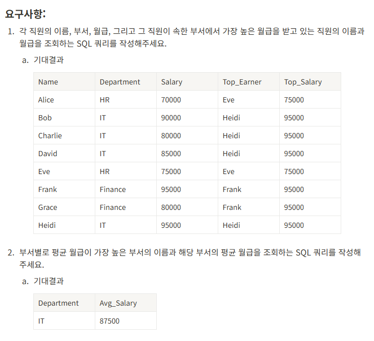 2. 사람별로 부서를 보여주고 급여를 보여준 후 해당부서의 최고급여자, 최고급여를 보여주고 있다. 행렬의 연동이 필요하기에 join을 사용해야한다.