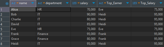 1. 우선 기대결과를 보면 Top_Earner, Top_Salary를 볼 수 있다 각 부서별 최고급여를 받는 사람이 누구인지, 급여는 얼마인지를 보여주는 컬럼으로 보인다.
