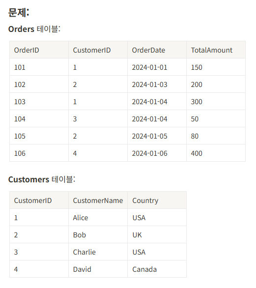 1. 고객 이름과 국적은 Customer 테이블, totalamount는 Orders테이블 기대결과에 맞게 출력하려면 join 사용 필요